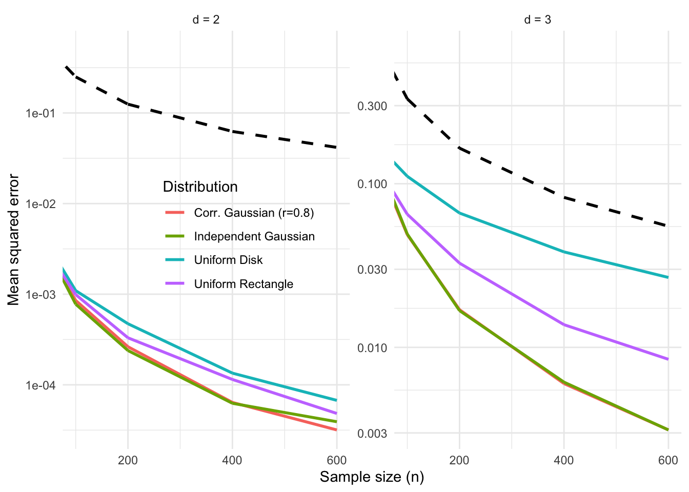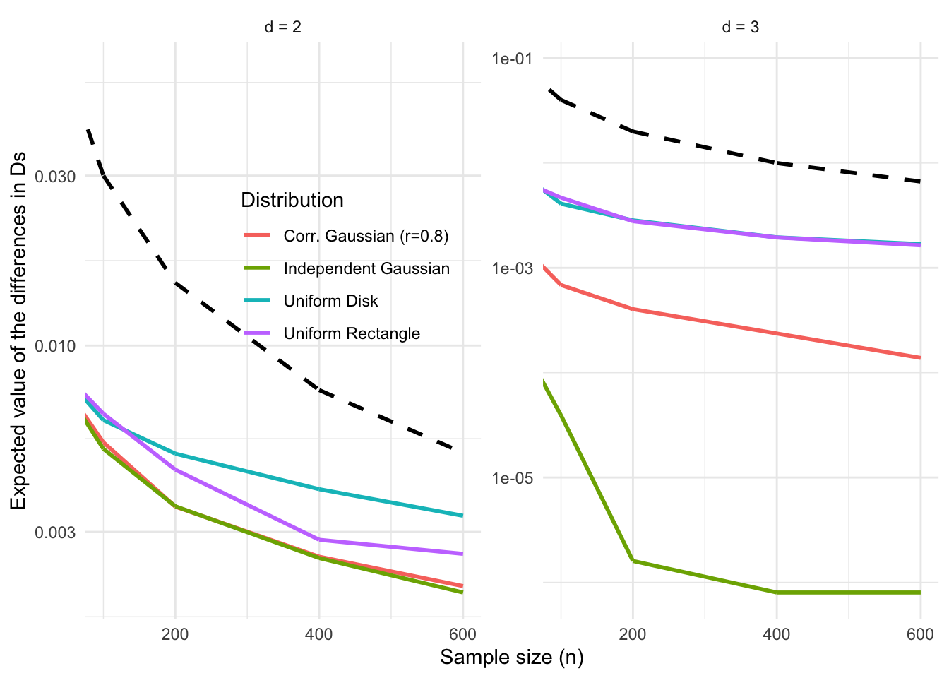 # Set seed for reproducibilityset.seed(20421)# Simulation parameterssample_sizes <-c(50, 100, 200, 400, 600)dimensions <-c(2, 3)distributions <-c("uniform_rectangle", "uniform_disk", "gaussian_independent", "gaussian_correlated")correlation <-0.8n_sims <-250#cat("Running main theorem simulations...\n")# Run all simulationsall_theorem_data <-data.frame()for(d in dimensions) {for(dist in distributions) {for(n in sample_sizes) {#cat("\n--- Running", dist, "d =", d, "n =", n, "---\n") sim_data <-simulate_main_theorem(n, d, dist, correlation, n_sims) all_theorem_data <-rbind(all_theorem_data, sim_data) } }}# Clean up distribution labelsall_theorem_data$distribution_clean <-case_when( all_theorem_data$distribution =="uniform_rectangle"~"Uniform Rectangle", all_theorem_data$distribution =="uniform_disk"~"Uniform Disk", all_theorem_data$distribution =="gaussian_independent"~"Independent Gaussian", all_theorem_data$distribution =="gaussian_correlated"~paste0("Corr. Gaussian (r=", correlation, ")"),TRUE~ all_theorem_data$distribution)cat("\nSimulations complete. Creating plots...\n")