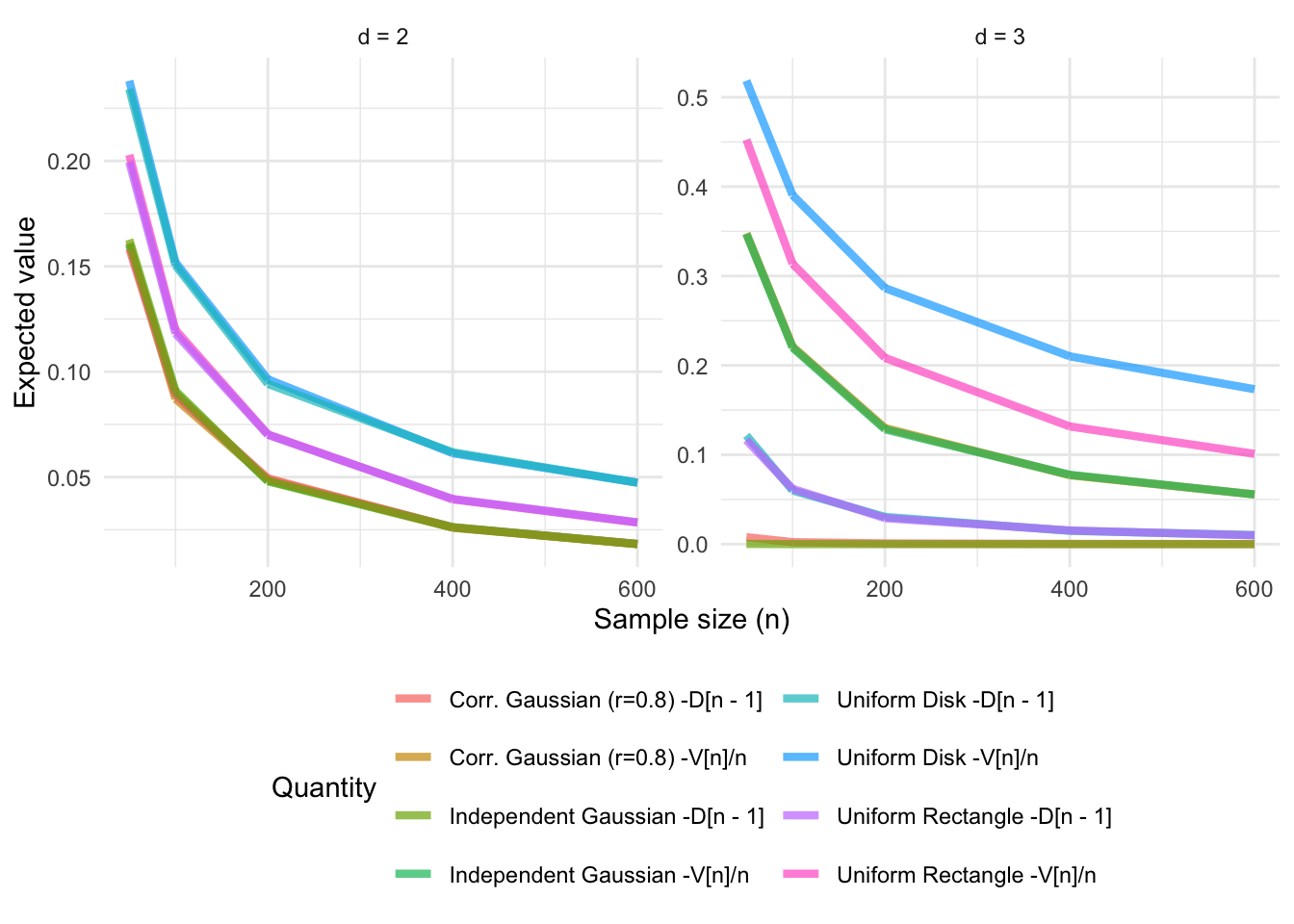 # Function to estimate D_n using Monte Carloestimate_D_n <-function(hull_points, distribution, d, correlation =0.5, n_test =5000) {# Generate test points from the same distribution test_points <-generate_distribution_points(n_test, d, distribution, correlation)if(d ==2) {# Use point.in.polygon for 2Dif(nrow(hull_points) <3) return(1) # If no proper hull, D_n = 1# Ensure hull is closedif(!all(hull_points[1,] == hull_points[nrow(hull_points),])) { hull_points <-rbind(hull_points, hull_points[1,]) } inside_count <-sum(point.in.polygon(test_points[,1], test_points[,2], hull_points[,1], hull_points[,2]) >0) D_n <-1- inside_count / n_test } elseif(d ==3) {# Simple approximation for 3D using bounding boxif(nrow(hull_points) <4) return(1) bbox_min <-apply(hull_points, 2, min) bbox_max <-apply(hull_points, 2, max)# Count points inside bounding box (conservative approximation) inside_bbox <-apply(test_points, 1, function(pt) {all(pt >= bbox_min) &&all(pt <= bbox_max) })# For Gaussian distributions, estimate the total "relevant" measureif(distribution =="uniform_rectangle") { total_measure <-4*2*1# [0,4] x [0,2] x [0,1] inside_count <-sum(inside_bbox) D_n <-1- inside_count / n_test } elseif(distribution =="uniform_disk") {# For uniform disk, same approach as above inside_count <-sum(inside_bbox) D_n <-1- inside_count / n_test } else {# For Gaussians, use a more conservative estimate# Assume most probability mass is within some reasonable bounds center <-colMeans(hull_points) inside_count <-sum(apply(test_points, 1, function(pt) {sqrt(sum((pt - center)^2)) <=0.6*sqrt(sum((bbox_max - bbox_min)^2)) })) D_n <-1- inside_count / n_test } }return(max(0, min(1, D_n))) # Clamp to [0,1]}