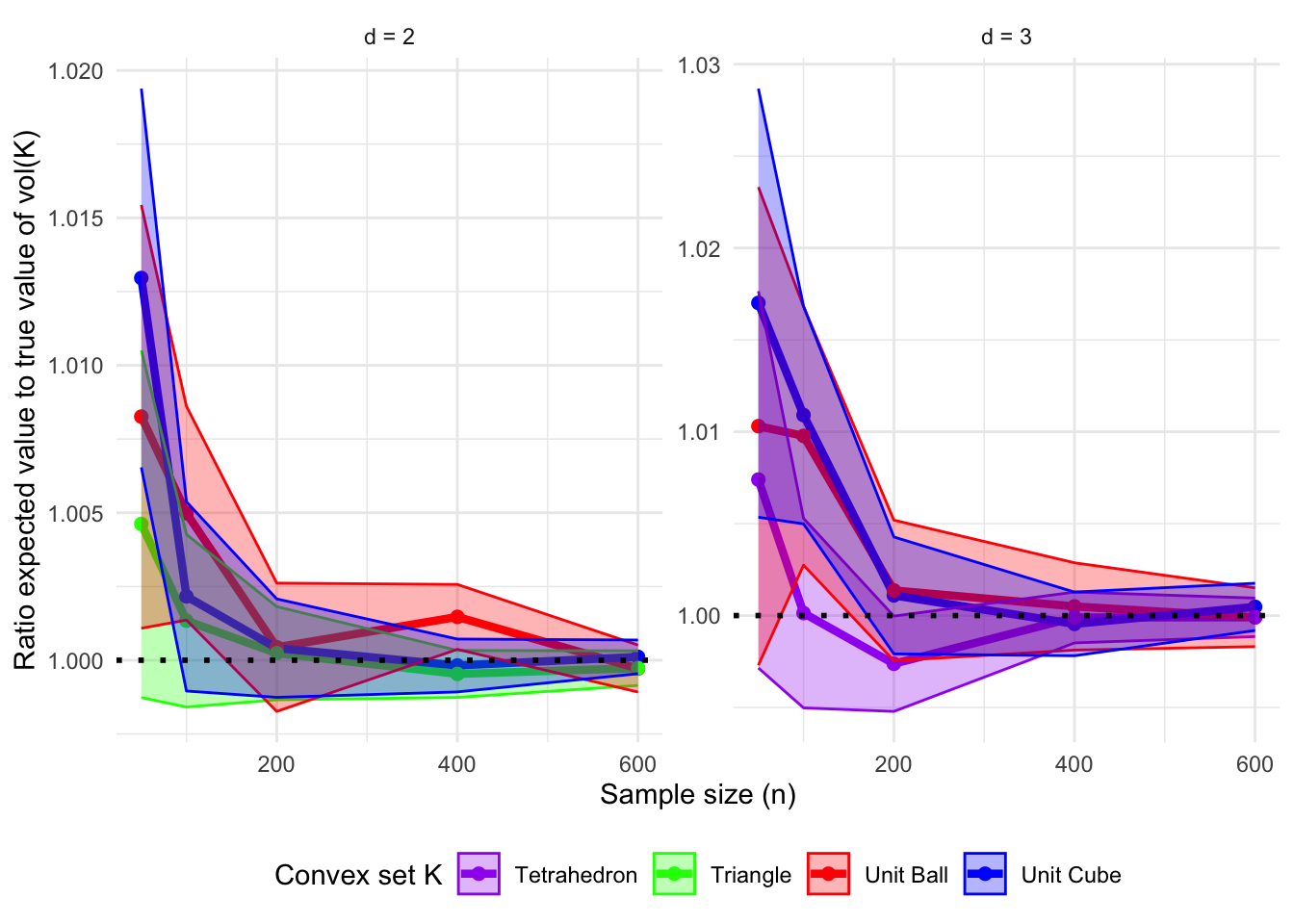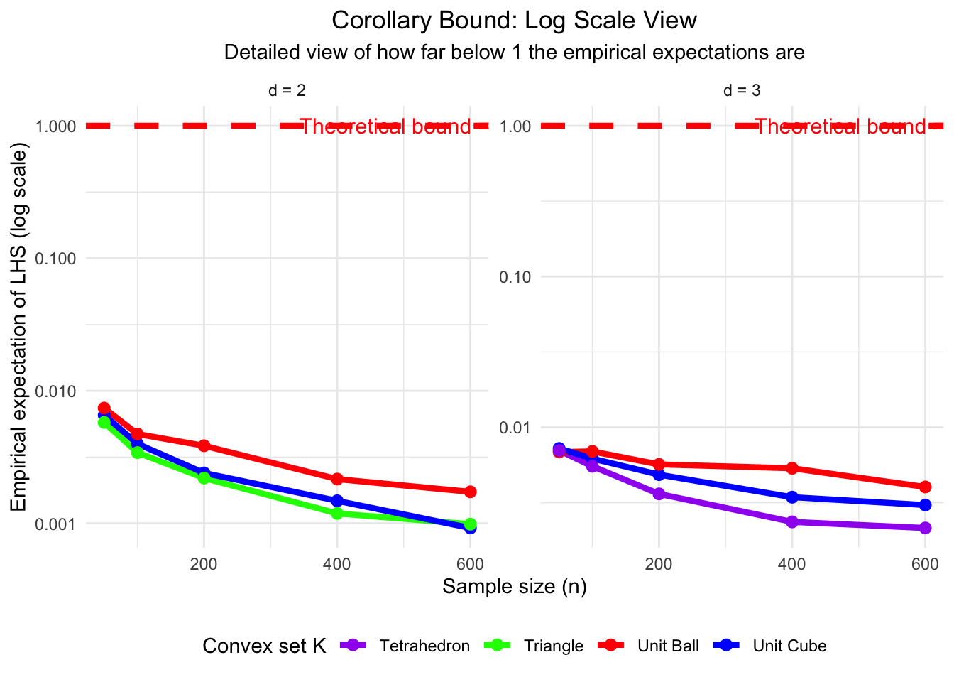# Print summary resultscat("\n=== COROLLARY VERIFICATION WITH SIMPLEX ===\n")cat("Theoretical bound: E[LHS] ≤ 1\n\n")summary_table <- summary_data %>%select(K_type_clean, d, n, empirical_expectation, prop_exceed_1) %>%arrange(d, K_type_clean, n)print(summary_table)cat("\nMaximum empirical expectation by case:\n")max_by_case <- summary_data %>%group_by(K_type_clean, d) %>%summarise(max_empirical_exp =max(empirical_expectation),min_n_for_max = n[which.max(empirical_expectation)],avg_empirical_exp =mean(empirical_expectation),.groups ='drop' )print(max_by_case)cat("\nVolume estimator performance (bias from 1):\n")vol_bias <- vol_estimator_data %>%group_by(K_type_clean, d) %>%summarise(avg_bias =mean(mean_vol_ratio -1),max_bias =max(abs(mean_vol_ratio -1)),.groups ='drop' )print(vol_bias)cat("\nCases where empirical expectation > 1:\n")violations <- summary_data[summary_data$empirical_expectation >1, ]if(nrow(violations) >0) {print(violations[, c("K_type_clean", "d", "n", "empirical_expectation")])} else {cat("None! The bound holds in all cases.\n")}cat("\n=== SUMMARY ===\n")cat("All empirical expectations are smaller than 1, suggesting the bound is quite conservative.\n")cat("The tetrahedron (4-simplex in 3D) case has been added.\n")cat("Volume estimator shows good performance across all convex sets.\n")