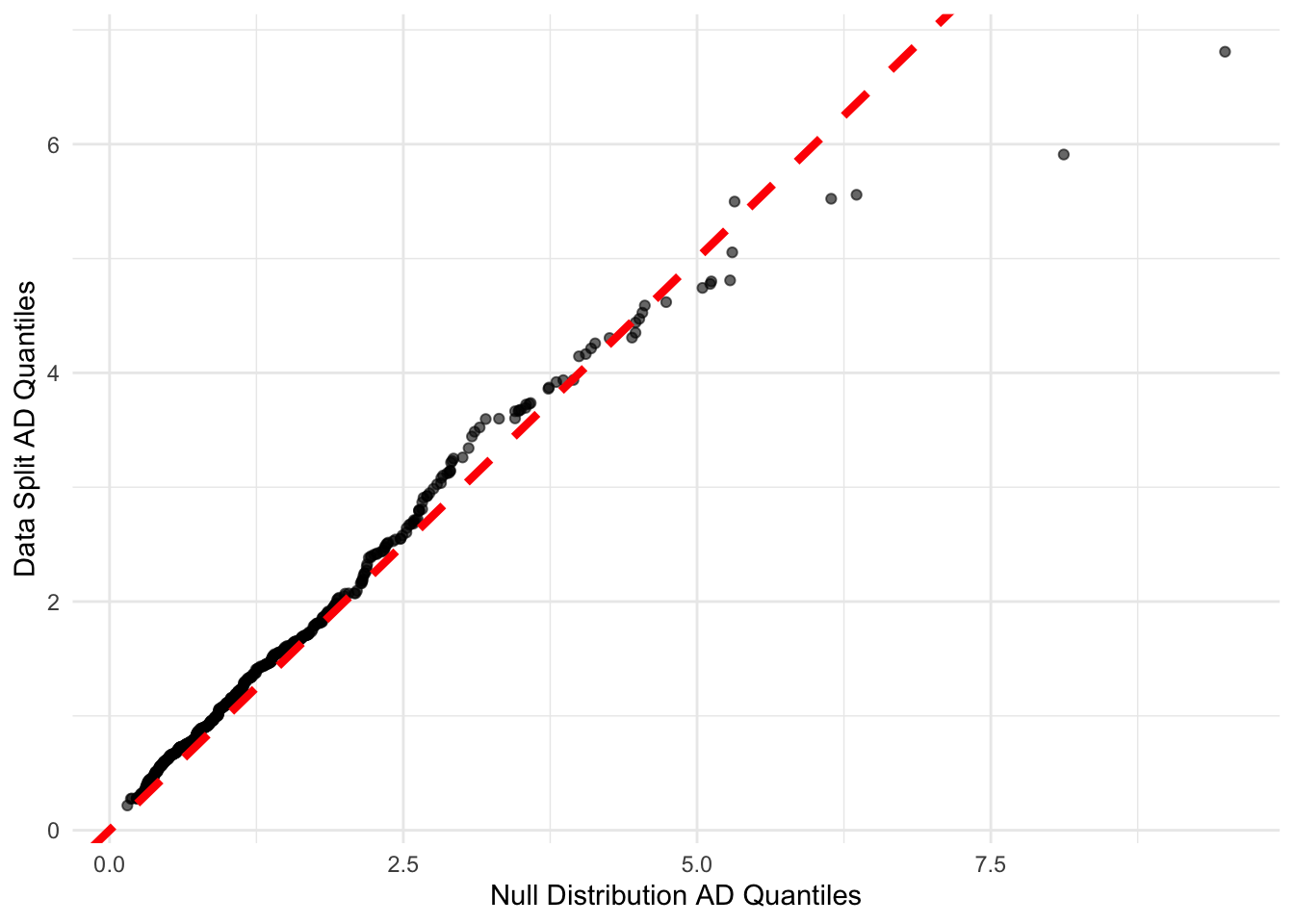 #| fig-cap: "QQ plot for AD with null on x axis and data split AD on y."