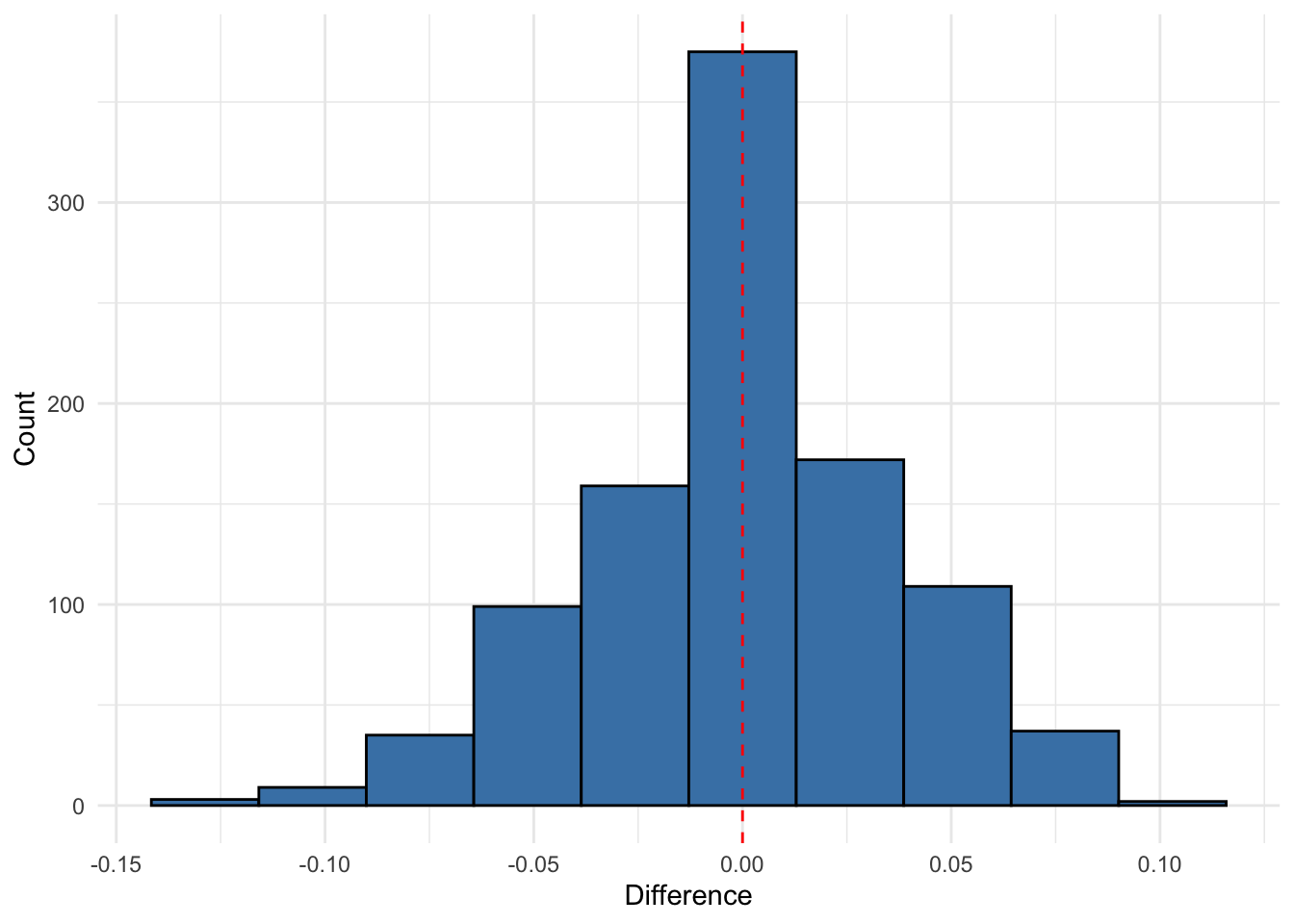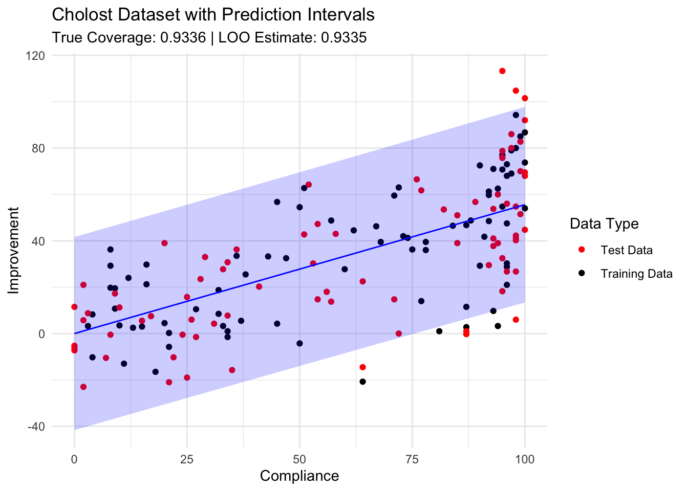 ggsave("histogramdifferences.png",p2,width=6,height=4,bg="white")# Create a scatter plot with the data and prediction intervals# (Using one random training set for visualization)set.seed(44112)train_indices <-sample(1:nrow(cholost_clean), size =floor(nrow(cholost_clean)/2))train_data <- cholost_clean[train_indices, ]test_data <- cholost_clean[-train_indices, ]X_train <-as.matrix(train_data[, predictor_var, drop =FALSE])Y_train <- train_data[[response_var]]# Create a grid of values for z to show the prediction intervalz_grid <-seq(min(cholost_clean$z), max(cholost_clean$z), length.out =100)X_grid <-matrix(z_grid, ncol =1)predictions <-data.frame(z = z_grid, y_pred =NA, lower =NA, upper =NA)for (i in1:length(z_grid)) { pred_interval <-calculate_pred_interval(X_train, Y_train, X_grid[i, , drop =FALSE], alpha =0.05) predictions$y_pred[i] <- pred_interval$prediction predictions$lower[i] <- pred_interval$lower predictions$upper[i] <- pred_interval$upper}p3 <-ggplot() +geom_point(data = train_data, aes(x = z, y = y, color ="Training Data")) +geom_point(data = test_data, aes(x = z, y = y, color ="Test Data")) +geom_line(data = predictions, aes(x = z, y = y_pred), color ="blue") +geom_ribbon(data = predictions, aes(x = z, ymin = lower, ymax = upper), alpha =0.2, fill ="blue") +scale_color_manual(values =c("Training Data"="black", "Test Data"="red")) +labs(title ="Cholost Dataset with Prediction Intervals",subtitle =paste("True Coverage:", round(mean(results$true_coverage), 4), "| LOO Estimate:", round(mean(results$loo_coverage), 4)),x ="Compliance", y ="Improvement", color ="Data Type") +theme_minimal()# Display plots#grid.arrange(p1, p2, p3, ncol = 2, layout_matrix = rbind(c(1,2), c(3,3)))print(p1)